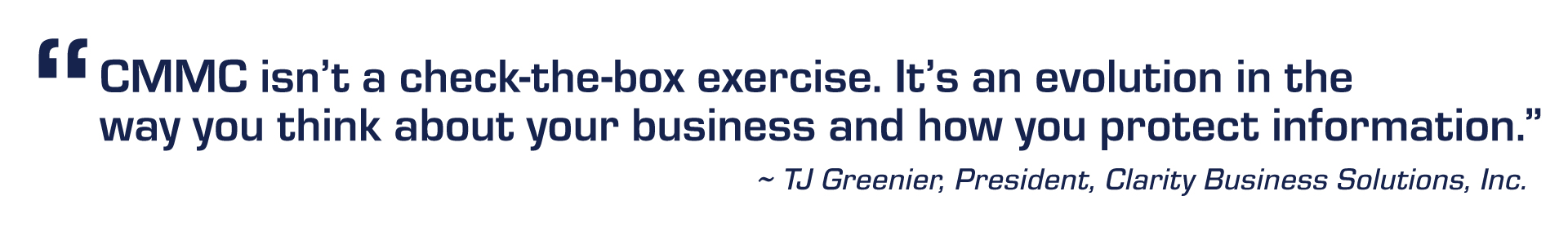 Shortly after he began researching CMMC two years ago, TJ Greenier, President of Clarity Business Solutions, Inc., created a round table of small business leaders to work through questions and share insights. At monthly meetings, representatives of more than 50 companies have worked on a range of issues, such as acceptable processes for encrypting e-mails and early questions about how Google Workspace could meet CMMC requirements.